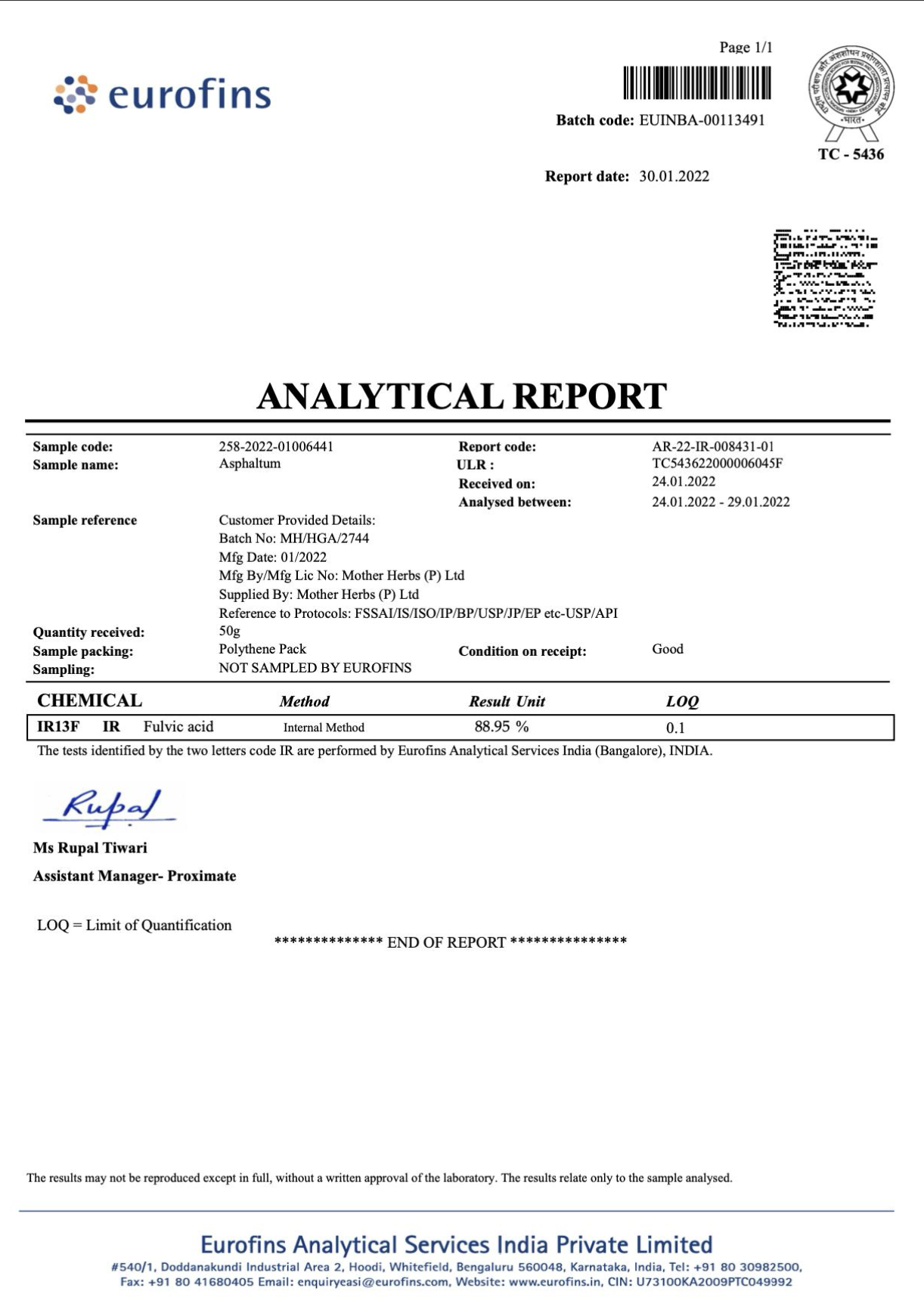 Eurofins testresultat av shilajit från Nordlab fann att produkten innehåller så mycket som 88,95 % fulvinsyra!